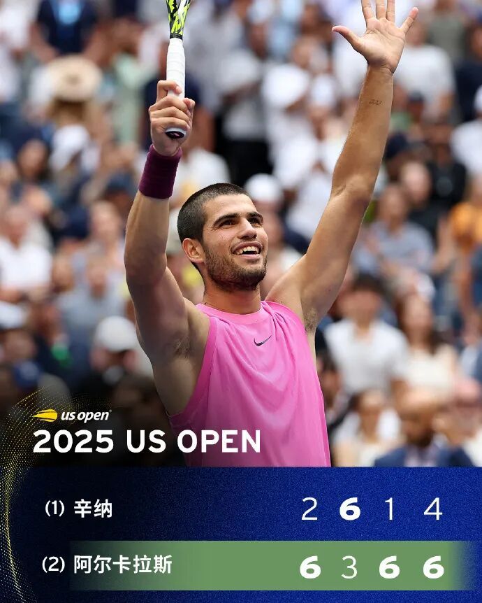 北京时间9月8日凌晨,2025美国网球公开赛男单决赛在头号种子辛纳与2号种子阿尔卡拉斯之间展开。经过2小时42分的激烈对抗,阿尔卡拉斯以6-2、3-6、6-1、6-4战胜卫冕冠军辛纳,时隔三年再次捧得美网男单冠军奖杯。