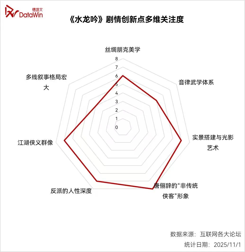 结合《水龙吟》剧情创新关注度统计图,丝绸朋克美学数值6牛金所,音律武学体系数值5可知,作品构建的“中式赛博玄幻”美学体系,没有自说自话,是获得了广大观众的真实感知与热烈讨论的。