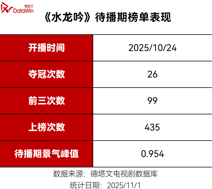自开拍之日起,凭借服化道、人物海报与场景概念图多次引发观众热议的东方玄侠巨制《水龙吟》,播出前已26次登顶德塔文待播榜单,累计上榜435次的同时,三平台联合预约量突破728.8万。