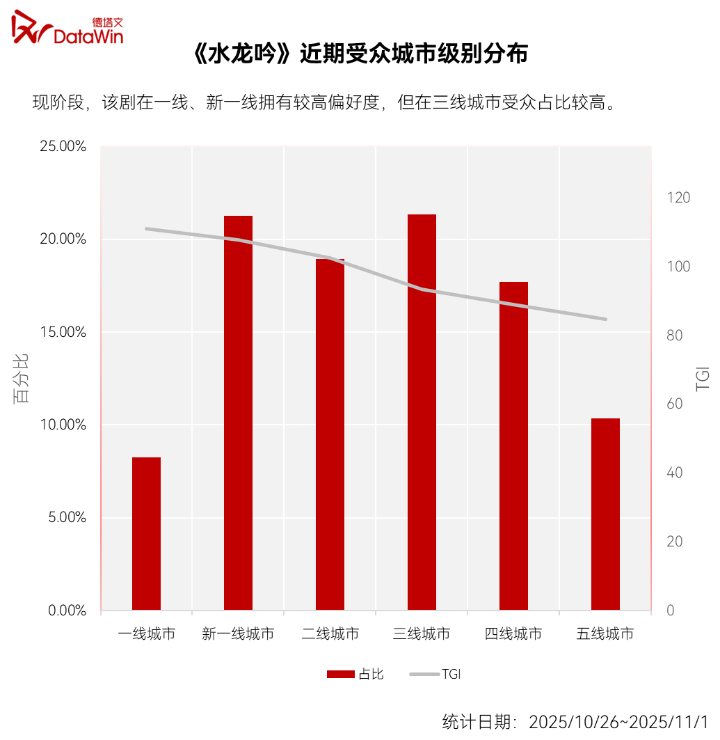 从线级城市占比和TGI来看,《水龙吟》的市场渗透模式主打“中心开花,全域辐射”。先在高线城市确立品牌格调,又在中低线城市收获人气基本盘,兼顾“引领性”与“普适性”,爆剧潜力展露无遗。