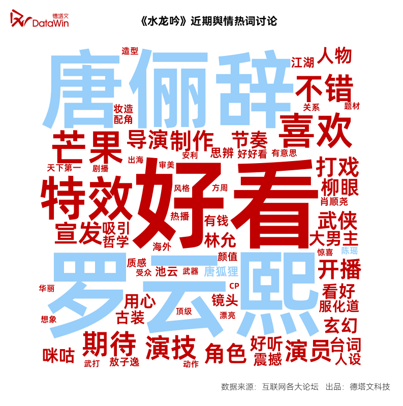 除了“好看”、“喜欢”、“不错”等直接的情感表达,和核心角色(演员)“唐俪辞”“罗云熙”外,“特效”、“制作”、“武打”、“服化道”、“剧情”和“导演”等一系列代表着工业化水准的关键词被广泛提及,表明观众对该剧的盖章认可是覆盖了从剧本、表演到视听语言、美学表达的全方位的。基于此,《水龙吟》由国内到国外热度及口碑形成了正向循环,倒也不足为奇了。