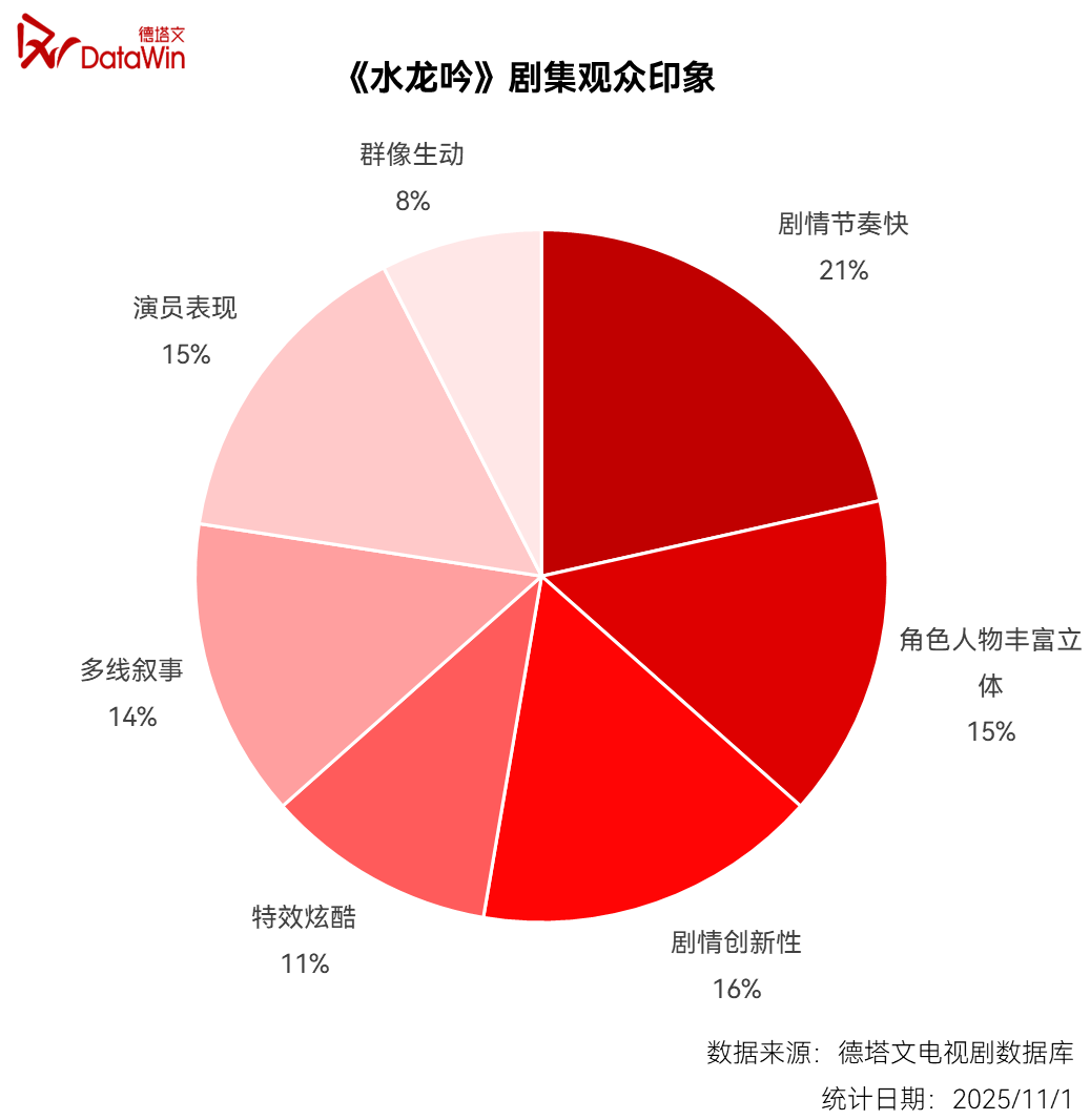 《水龙吟》近期剧集观众印象,角色人物丰富立体和演员表现占比15%,群像生动占比8%。显而易见,整部剧经由江湖纷争串连起的多元化人物图谱,达成了与观众们的“双向奔赴”,加上人物曲以“声画同帧”形式深度绑定角色命运,收获好评无数。