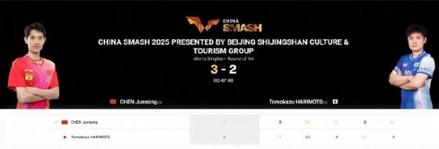 据北京 . 日报中盛投资,2025 中国大满贯男单 1/32 决赛,国乒选手陈俊菘战胜张本智和晋级。