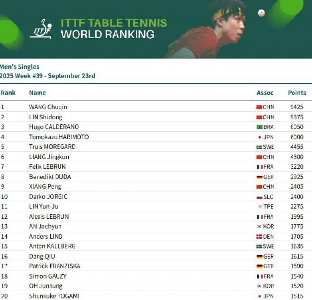 此前,9 月 23 日,2025 国际乒联第 39 周排名公布,其中,张本智和世排第四。