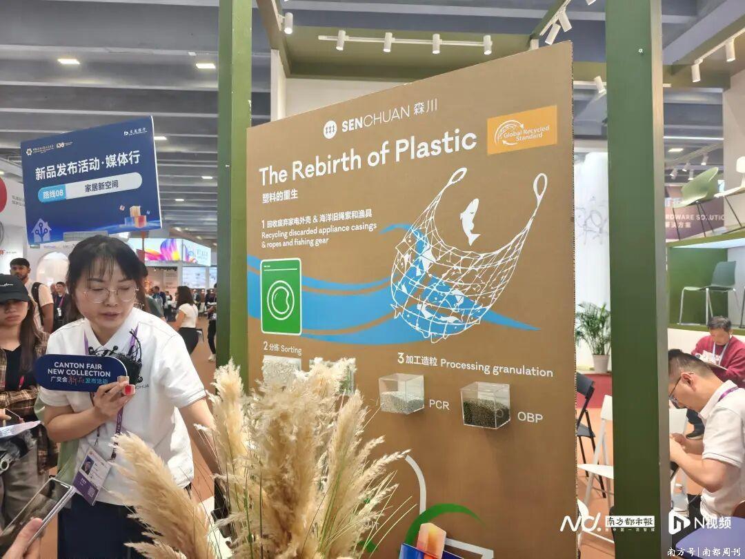展品前的材料溯源海报显示:这款坐椅原料来自回收的家电外壳和渔船旧绳索,经过分拣、注塑重塑后,变成了线条利落的北欧风坐凳,售价仅比同类非环保坐凳高5%,因此开展当天尤其受到澳洲、欧洲采购商的关注。
