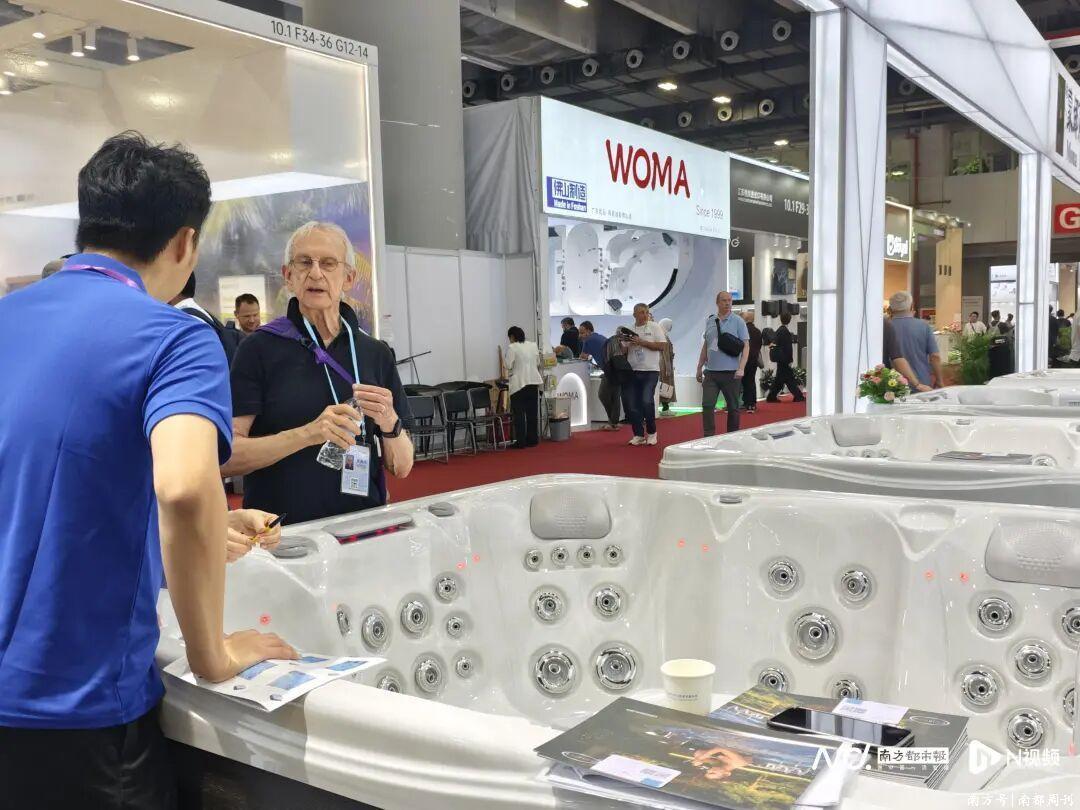 年轻消费者对场景互动的追求,还体现在对自然融合的渴望上。在广东圣罗兰卫浴的展位,一款带有“瀑布冲浪”功能的按摩浴缸前,吸引了几位来自俄罗斯的采购商驻足交流——水流模拟自然瀑布的节奏,搭配星空灯,营造出SPA的氛围。