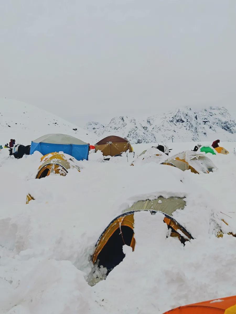10月5日早上8时,山中的暴风雪暂停,“无极”一行也决定在一个半小时后的9点半左右出发。“我们基本上什么重装都没带,只用背包带了当天吃喝的,还有装备里的保暖羽绒服,抓绒衣,其他的衣物都放在了营地。”“无极”说,当时的营地大约有100多人是游客,还有领队、协作一共总人数加起来有两三百人,“其他队伍看到我们走得有点远了,也就跟了上来”。