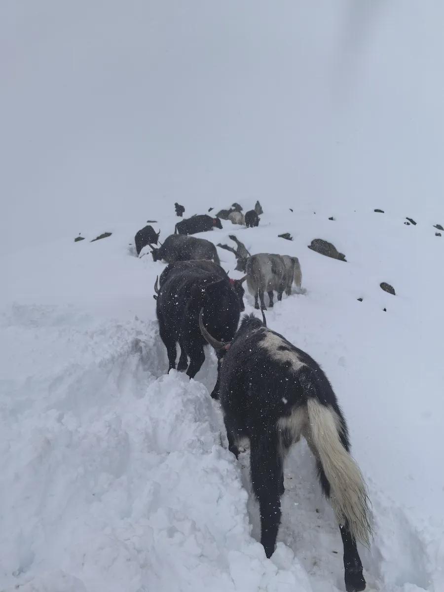 “牦牛队大概在下午五点就出山了,人跟在后面也算比较快,基本上在六点到六点半就出了山口。”“无极”说,当时经过垭口最高海拔是5360米,从垭口走下去到山区出口要下降1400米左右,所以整条路线还是比较陡峭的。牦牛在开了路之后,由于雪比较厚,整条道路都压实了,加上气温比较低,整条道路还是比较滑的,“很多人也是摔跤了好几次,但幸好没有人员受伤”。
