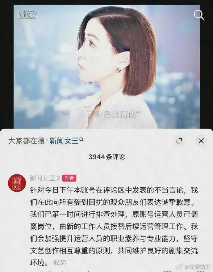 随后,《新闻女王2》账号发文道歉,称:“针对今日下午本账号在评论区中发表的不当言论,我们在此向所有受到困扰的观众朋友们表达诚挚歉意。我们已第一时间进行排查处理,原账号运营人员已调离岗位,由新的工作人员接替后续运营管理工作。我们会加强提升运营人员的职业素养与专业能力,坚守文艺创作相互尊重的原则,共同维护良好的剧集交流环境。”